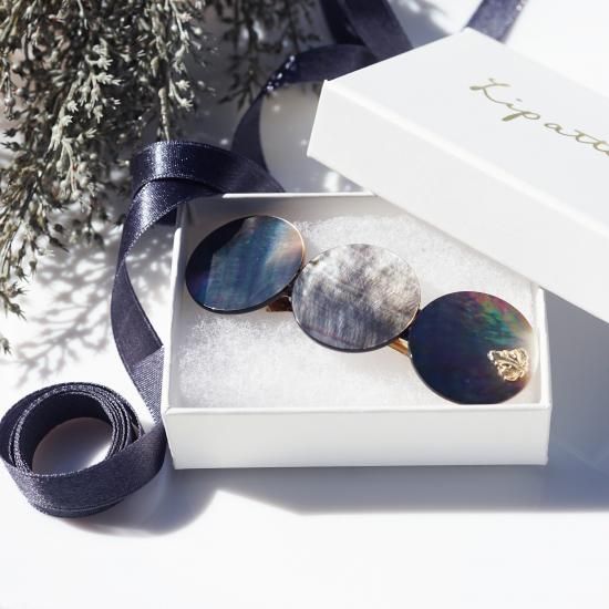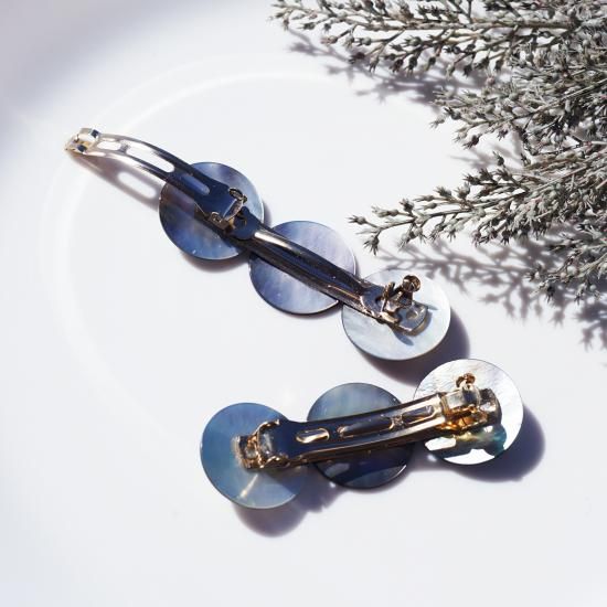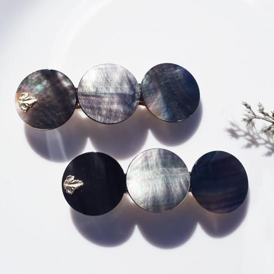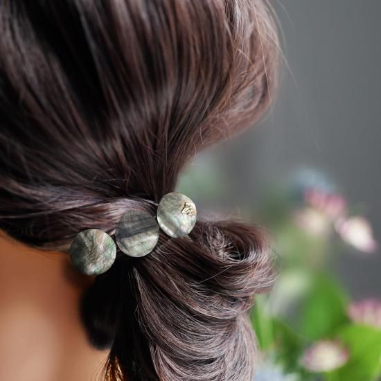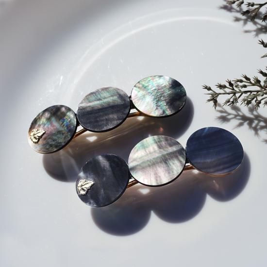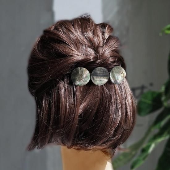 黒〜白、緑〜ピンクの光沢を持つ、芸術品の様なバレッタ。