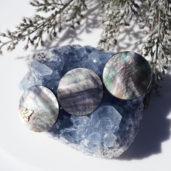 真珠母貝。真珠が作られる貝を用いています。貝の裏側にある真珠層を用いた素材です。光が当たると虹色に輝き、贅沢な美しい光沢を放ちます。