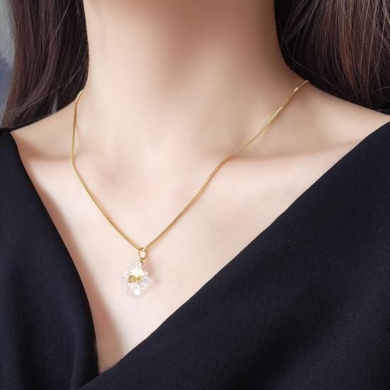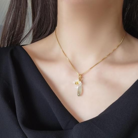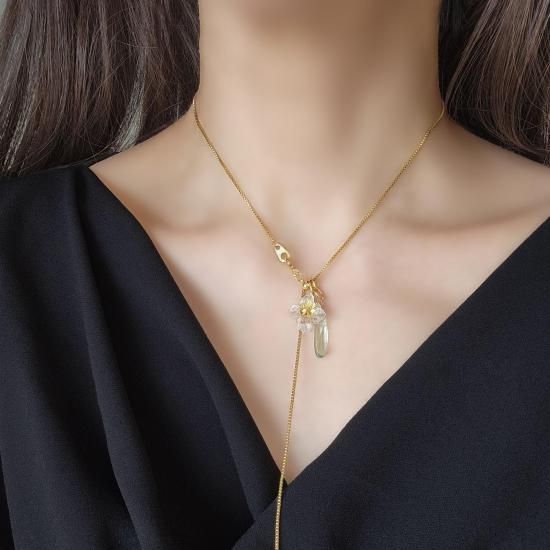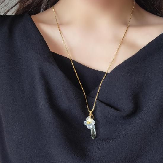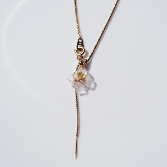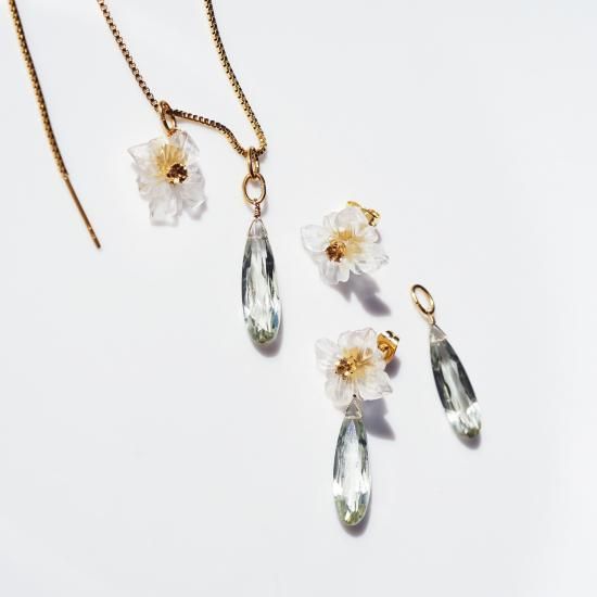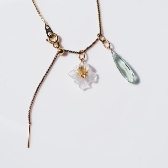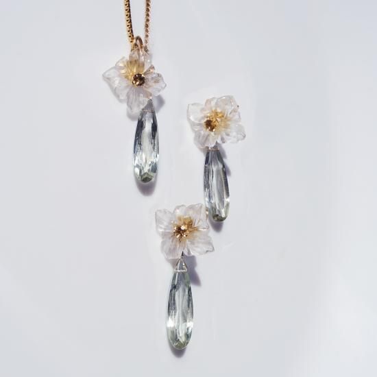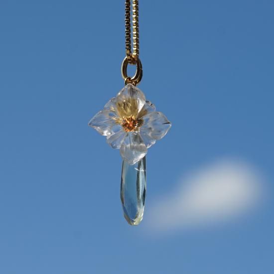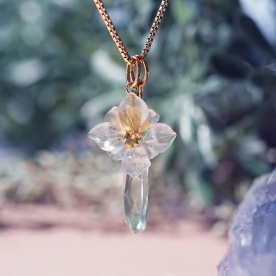 ヤマボウシの花の形に彫刻された水晶にシトリンとグリーンアメジストを合わせて、