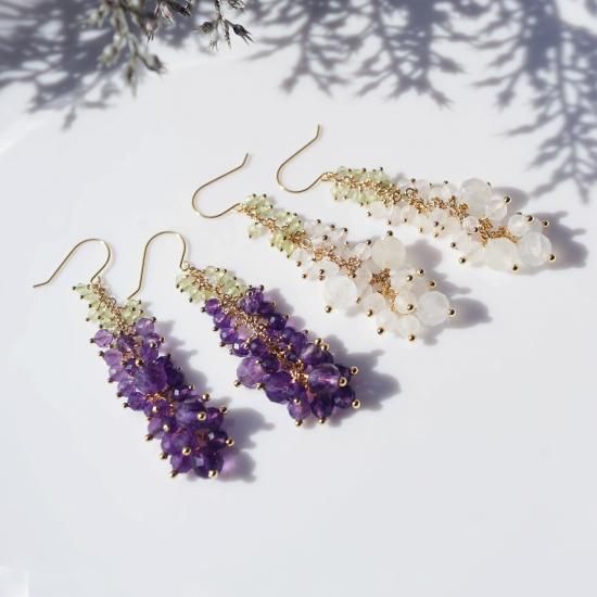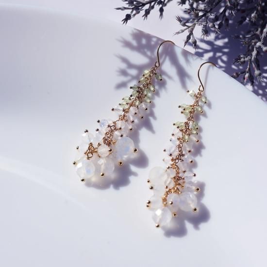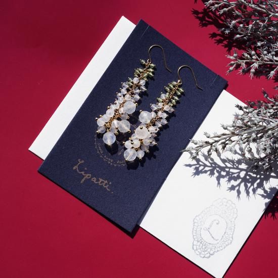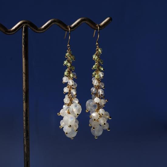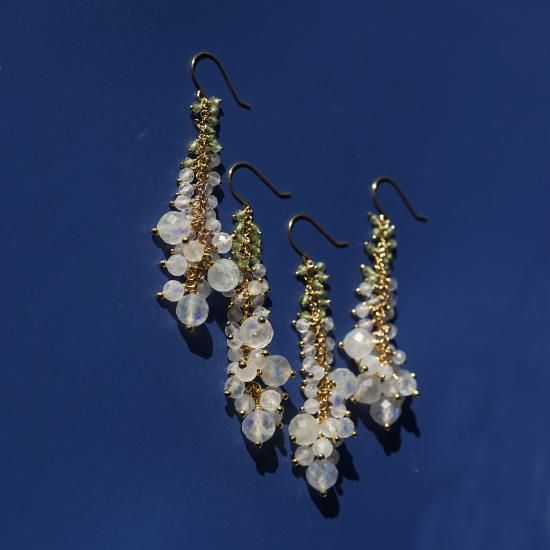 白に、青い光を返すブルームーンストーン(ペリステライト)を74粒駆使して、デルフィニウムの花房のもつ素晴らしいグラデーションを表現しました。